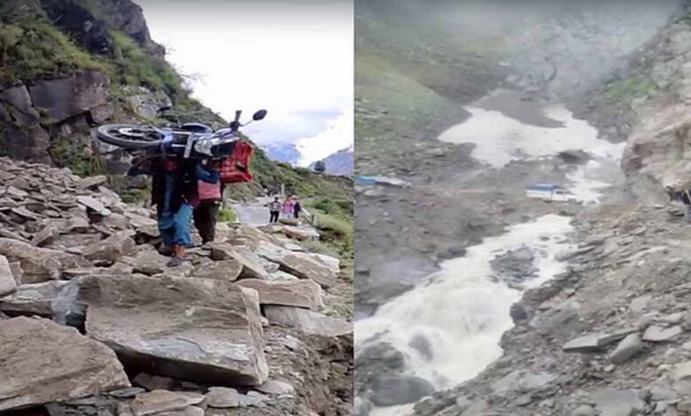 भूस्खलन से सड़क बंद हुई तो युवक ने कंधे पर उठाकर दूसरी तरफ पहुंचाई बाइक