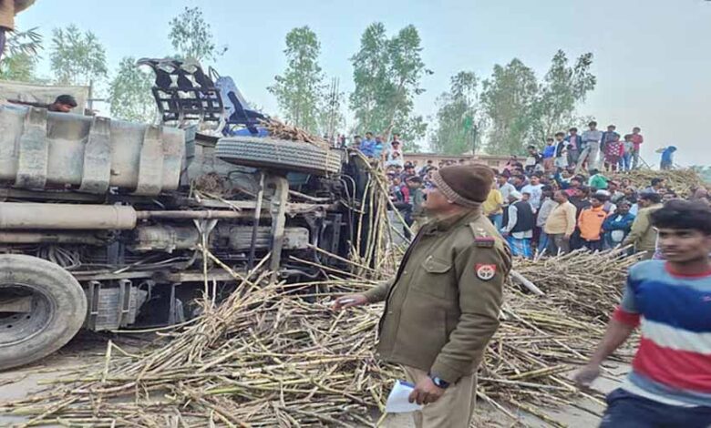 लखीमपुर खीरी में धौरहरा-सिसैया मार्ग पर गन्ने से भरा ट्रक पलट, कई बच्चे दबे