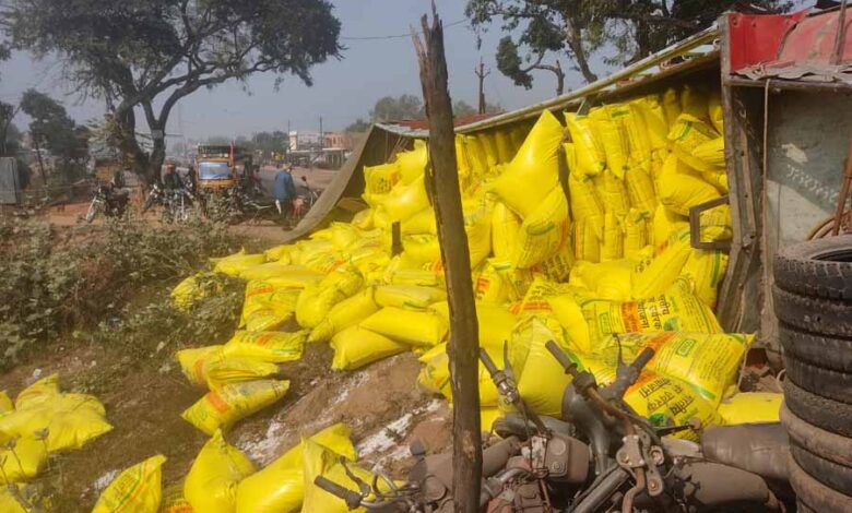 कोहरे के कारण यूरिया से भरा ट्रक पलटा