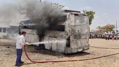 बस में लगी भीषण आग, फायर ब्रिगेड की टीम ने मौके पर पहुंचकर आग पर पाया काबू