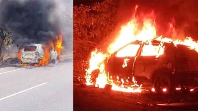 शॉर्ट सर्किट से इंजन में हुआ ब्लास्ट, परिवार सुरक्षित बाहर निकल आया, भीषण आग में पूरी कार जल गई