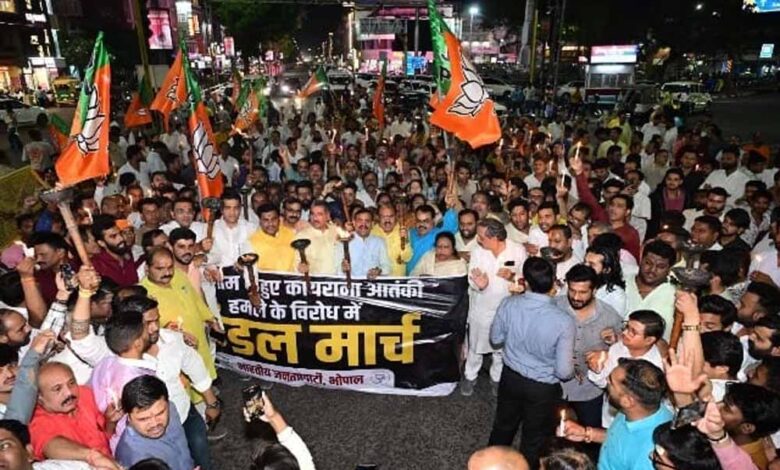 मशाल जुलूस निकाल कर जताया विरोध- वहीं पहलगाम आतंकी हमले के विरोध में गुरुवार शाम भाजपा ने न्यू मार्केट इलाके में मशाल जुलूस निकाला। भाजपा प्रदेश अध्यक्ष वीडी शर्मा की अगुवाई में निकले मशाल जुलूस में भाजपा नेताओं के साथ बड़ी संख्या में लोगों ने न्यू मार्केट के नानके पेट्रोल पंप से रोशनपुरा चौराहे तक पैदल मार्च किया औऱ रोशनपुरा चौराहे पर पहुंचकर आतंकवादी घटना का विरोध जताया और दो मिनट का मौन रखकर मृतकों को श्रद्धांजलि अर्पित की।