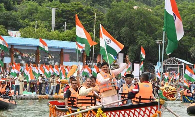मुख्यमंत्री डॉ. यादव प्रदेश में जारी हर घर तिरंगा अभियान के अंतर्गत भोपाल के बड़े तालाब के बोट क्लब से निकाली गई जल तिरंगा यात्रा का शुभारंभ कर संबोधित कर रहे थे। उन्होंने झंडी दिखाकर जल तिरंगा यात्रा की शुरुआत की। मुख्यमंत्री डॉ. यादव ने बड़ी संख्या में तिरंगे गुब्बारे आकाश में छोड़े। एशियाई और ओलंपिक गेम्स में उपयोग में आने वाली बोट्स में सवार वॉटर स्पोर्ट्स खिलाड़ी अनुशासन और गरिमा के साथ तिरंगा लेकर बड़े तालाब में आगे बढ़े, क्षेत्र का नभ-जल और धरा तिरंगामय हो गया। देशभक्ति, एकता और समर्पण की भावना को और सशक्त करते इस अनोखे, रोमांचक आयोजन में बड़ी संख्या में वॉटर स्पोर्ट्स खिलाड़ी, विद्यार्थी और राजधानीवासी शामिल हुए। इस अवसर पर खेल एवं युवा कल्याण मंत्री श्री विश्वास सारंग, पिछड़ा वर्ग एवं अल्पसंख्यक कल्याण राज्यमंत्री (स्वतंत्र प्रभार) श्रीमती कृष्णा गौर, प्रदेशाध्यक्ष श्री हेमंत खंडेलवाल, भोपाल महापौर श्रीमती मालती राय और श्री रविन्द्र यति उपस्थित थे।