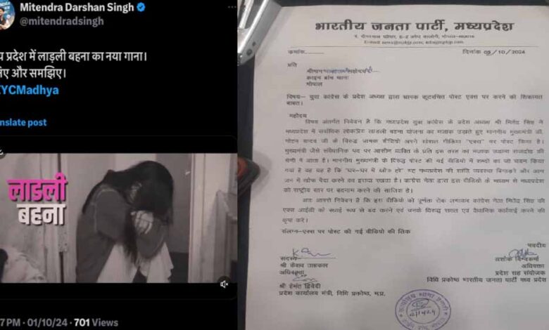 भाजपा के विधि प्रकोष्ठ की ओर से शिकायत देने के साथ यह मांग की गई है कि तुरंत मितेंद्र दर्शन सिंह का एक्स अकाउंट स्थाई रूप से बन कर दिया जाए। भाजपा ने कहा है कि इस तरह के वीडियो डालकर वह प्रदेश में शांति व्यवस्था बिगाड़ने का प्रयास कर रहे हैं। शिकायत में कहा गया है, 'मध्य प्रदेश युवा कांग्रेस के प्रदेश अध्यक्ष मितेंद्र सिंह ने लाडली बहना योजना का मजाक उड़ाने के साथ मुख्यमंत्री मोहन यादव के खिलाफ भ्रामक वीडियो एक्स पर पोस्ट किया।'