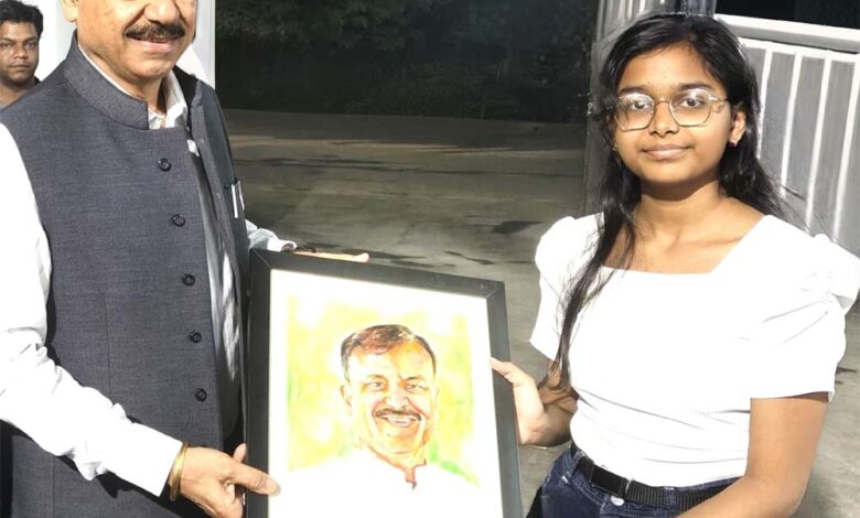 स्कूल शिक्षा मंत्री सिंह को बाल चित्रकार ने भेंट किया उनका चित्र
