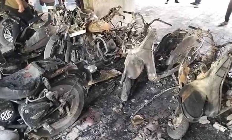 न्यायधानी के तोरवा क्षेत्र के वैशाली रीजेंसी अपार्टमेंट की पार्किंग में खड़ी गाड़ियों में रविवार और सोमवार की दरमियानी रात भीषण आग लग गई. घटना में 10 बाइक पूरी तरह जलकर राख हो गईं. वहीं आग की चपेट में एक कार भी आई, जिसका एक हिस्सा बुरी तरह क्षतिग्रस्त हो गया. घटना की जानकारी होने पर अपार्टमेंट में रहने वाले लोगों ने पानी डालकर आग बुझाने की कोशिश की. वहीं घटना की सूचना तौर पर पुलिस में फायर ब्रिगेड को दी गई.