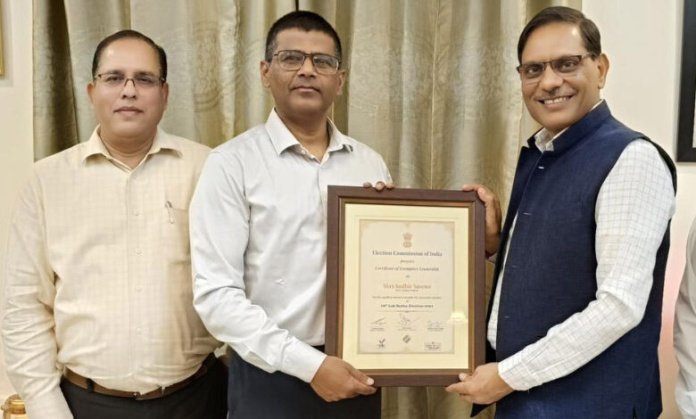 लोकसभा निर्वाचन-2024 के दौरान मध्यप्रदेश में सुचारू और निष्पक्ष चुनाव प्रक्रिया संपन्न हुई। इसे संपन्न कराने में पूर्व पुलिस महानिदेशक सुधीर सक्सेना और आईजी, स्टेट पुलिस नोडल अधिकारी (कानून व्यवस्था एवं सुरक्षा) अंशुमान सिंह की महत्वपूर्ण भूमिका रही। महत्वपूर्ण भूमिका के निर्वहन के लिए पूर्व डीजीपी सक्सेना और आईजी सिंह को भारत निर्वाचन आयोग द्वारा प्रमाण पत्र भेंट कर सम्मानित किया गया। भारत निर्वाचन आयोग द्वारा जारी प्रशंसा-पत्र को मुख्य निर्वाचन पदाधिकारी सुखवीर सिंह द्वारा दोनों अधिकारियों को प्रदान किया गया।