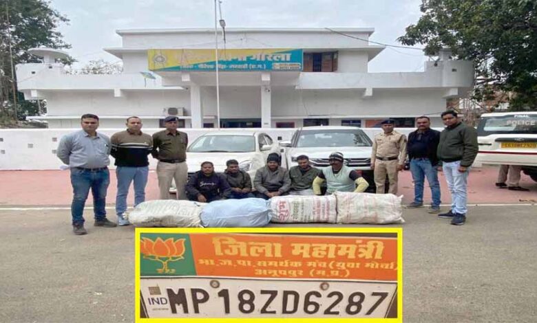 गांजे की तस्करी के लिए तस्कर नए तरीके अपना रहे हैं. कार में भाजपा जिला महामंत्री का नेम प्लेट लगाकर गांजा तस्करी का मामला सामने आया है. जिसमें पुलिस ने अंतर्राज्यीय गिरोह के पांच सदस्य को गिरफ्तार किया है. जिनके कब्जे से 7 लाख से अधिक का गांजा जब्त किया गया है.
