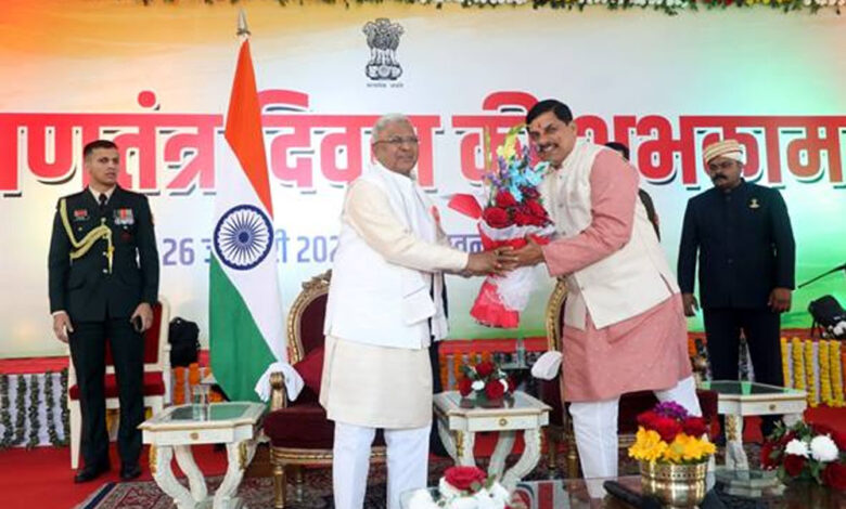 गणतंत्र दिवस पर राजभवन में आयोजित स्वागत समारोह में राज्यपाल मंगुभाई पटेल और मुख्यमंत्री डॉ. मोहन यादव ने एक-दूसरे को पुष्प-गुच्छ भेंट कर शुभकामनाएँ दी। राज्यपाल पटेल और मुख्यमंत्री डॉ. यादव ने आगंतुकों के साथ गणतंत्र दिवस की शुभकामनाओं का आदान-प्रदान किया।