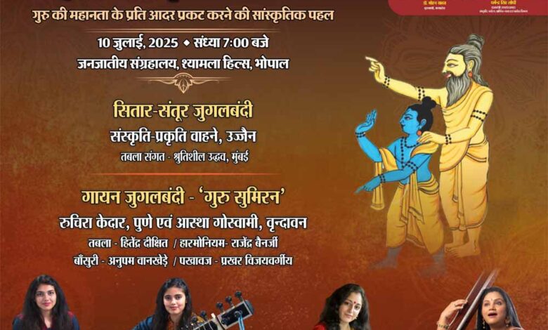 संचालक, संस्कृति श्री एन.पी. नामदेव ने बताया कि गुरु पूर्णिमा के अवसर पर भोपाल सहित संस्कृति विभाग के प्रदेश के विभिन्न शहरों में स्थित संगीत महाविद्यालयों में एक साथ गायन-वादन एवं नृत्य केन्द्रित आयोजन होंगे। भोपाल में मध्यप्रदेश जनजातीय संग्रहालय में 10 जुलाई, 2025 को सायं 7 बजे से ''गुरु पूर्णिमा पर्व'' का आयोजन होगा। इसमें सबसे पहले सितार-संतूर जुगलबंदी की प्रस्तुति होगी, जिसे उज्जैन की सुप्रसिद्ध संस्कृति-प्रकृति वाहने (वाहने सिस्टर्स) द्वारा प्रस्तुत किया जाएगा। इसके बाद गायन जुगलबंदी ''गुरु सुमिरन'' होगी, जिसे सुश्री रुचिरा केदार, पुणे एवं सुश्री आस्था गोस्वामी, वृंदावन द्वारा प्रस्तुत किया जाएगा।