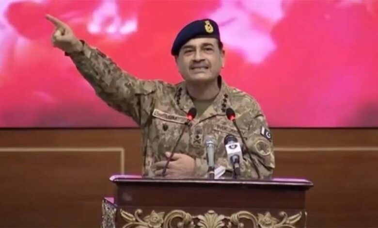 अपने संबोधन में पाकिस्तानी सेना प्रमुख ने कश्मीर मुद्दा भी उठाया। उन्होंने कहा कि दुनिया की कोई भी ताकत कश्मीर को पाकिस्तान से अलग नहीं कर सकती। उन्होंने कहा, "हमारे पूर्वजों ने बहुत त्याग किया है और हमने इस देश के निर्माण के लिए बहुत त्याग किया है और हम जानते हैं कि इसकी रक्षा कैसे करनी है।" उन्होंने आगे कहा, “मेरे प्यारे भाइयों और बहनों और बेटे और बेटियों, कृपया पाकिस्तान की कहानी मत भूलना और अपनी अगली पीढ़ी को पाकिस्तान की कहानी सुनाना मत भूलना, ताकि पाकिस्तान के साथ उनका रिश्ता कभी कमजोर न पड़े। चाहे वह तीसरी पीढ़ी हो, या चौथी पीढ़ी हो या पांचवीं पीढ़ी हो, वे जानते हैं कि पाकिस्तान उनके लिए क्या है।”