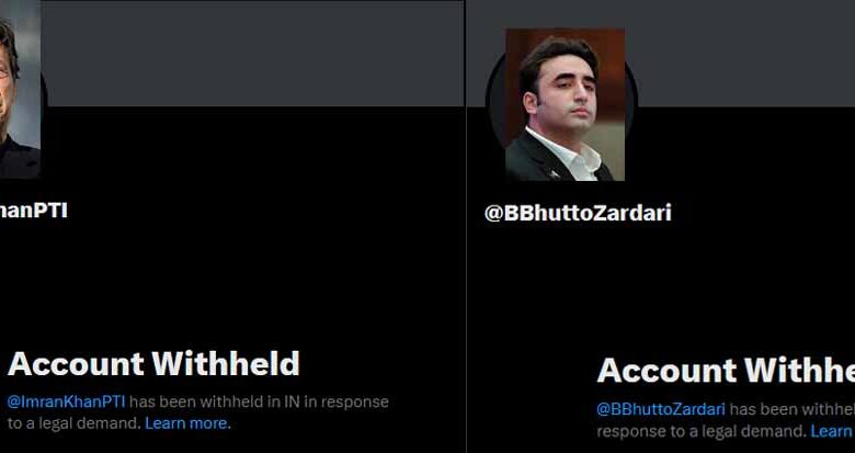 इमरान खान और बिलावल भुट्टो के 'एक्स' अकाउंट पर एक संदेश लिखा हुआ सामने आ रहा है। इसमें लिखा है कि कानूनी मांग के जवाब में इसे भारत में रोक दिया गया है। पाकिस्तानी राजनेताओं के एक्स अकाउंट की प्रोफाइल पिक्चर और कवर इमेज ब्लैंक (खाली) दिख रही है।