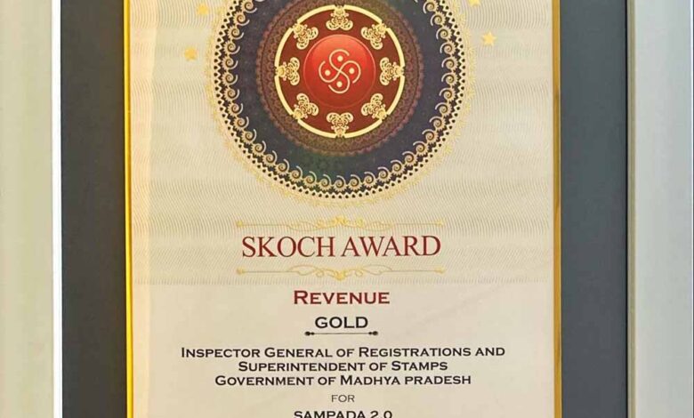 राजधानी नई दिल्ली में एक गरिमामय कार्यक्रम में प्रोफेसर महेंद्र एस देव चेयरमैन, प्रधानमंत्री इकोनॉमिक एडवाइजरी कॉउंसिल एवं प्रोफेसर आर. कविता राव, संचालक नेशनल इंस्टिट्यूट ऑफ़ पब्लिक फाइनेंस एंड पॉलिसी तथा स्कॉच ग्रुप द्वारा "संपदा 2.0" के क्रियान्वयन के लिए महानिरीक्षक पंजीयन एवं अधीक्षक मुद्रांक, वाणिज्यिक कर विभाग मध्यप्रदेश शासन को राष्ट्रीय स्कॉच स्वर्ण पुरस्कार 2025 प्रदान किया गया। परियोजना प्रभारी अधिकारी वरिष्ठ जिला पंजीयक श्री स्वप्नेश शर्मा ने पुरस्कार प्राप्त किया।