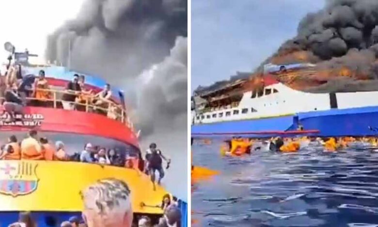 आग रविवार दोपहर स्थानीय समयानुसार लगभग 1.30 बजे लगी. वायरल वीडियो में घबराये हुए यात्रियों को देखा जा सकता है, जिनमें से कुछ अपने बच्चों के साथ आग से बचने के लिए समुद्र में छलांग लगाते हुए दिखाई दे रहे हैं. इस भयावह फुटेज में यात्री चमकीले नारंगी रंग की लाइफ जैकेट पहनकर पानी में कूदते दिखाई दे रहे हैं और जहाज में आग तेजी से फैल रही है. KM Barcelona III, KM Venecian और KM Cantika Lestari 9F नामक तीन बड़े जहाजों को तुरंत मौके पर भेजा गया.