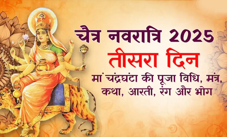 चैत्र नवरात्रि के तीसरे दिन मां चंद्रघंटा की पूजा की जाती है। देवी भागवत पुराण के अनुसार, मां चंद्रघंटा का रूप अत्यंत शांत, सौम्य और ममतामयी है, जो अपने भक्तों को सुख-समृद्धि और शांति प्रदान करता है। इस दिन विशेष पूजा करने से आत्मविश्वास में वृद्धि होती है, जीवन में खुशहाली आती है और सामाजिक प्रतिष्ठा भी बढ़ती है। पूजा के फलस्वरूप, लोग आपको अधिक सम्मान देने लगते हैं। मां चंद्रघंटा का यह रूप विशेष रूप से सरल और शांति से परिपूर्ण है। वे अपने भक्तों की समृद्धि में वृद्धि करने के लिए प्रसिद्ध हैं। मां चंद्रघंटा की पूजा से न केवल भौतिक सुख में वृद्धि होती है, बल्कि समाज में आपका प्रभाव भी बढ़ता है। बता दें कि इस बार द्वतीया और तृतीया नवरात्री व्रत एक ही दिन किया जाएगा। आइए जानते हैं मां चंद्रघंटा की पूजाविधि, भोग, पूजा मंत्र और आरती के बारे में।