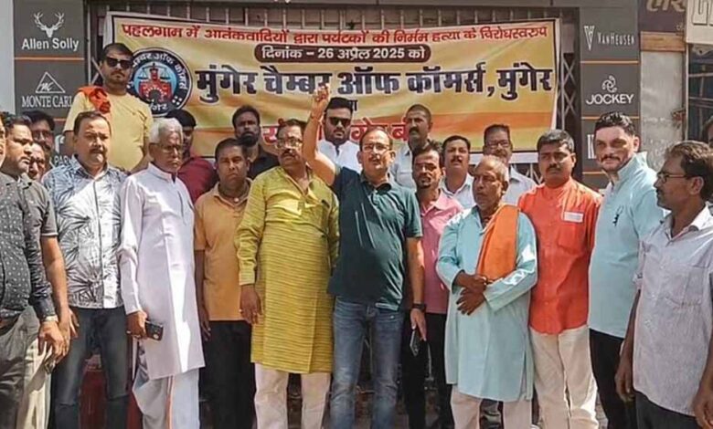 जम्मू-कश्मीर के पहलगाम में हुए पर्यटकों की हत्या के विरोध में मुंगेर बाजार आज पूरी बंद है। मुंगेर चेंबर ऑफ कॉमर्स के आवाह्न पर यह बंद किया गया है। चेंबर के सदस्यों और व्यवसाइयों ने शहर में घूम-घूम कर दुकान बंद करवाई। सदस्यों ने पाकिस्तान मुर्दाबाद आतंकी पर कार्रवाई हो, इसको लेकर जमकर नारेबाजी भी की।