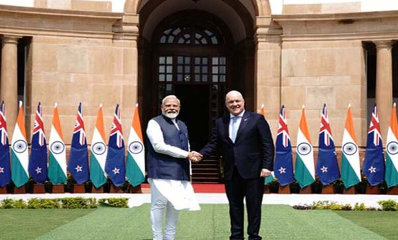प्रधानमंत्री नरेंद्र मोदी और उनके न्यूजीलैंड समकक्ष क्रिस्टोफर लक्सन ने सोमवार को द्विपक्षीय संबंधों को मजबूत करने, व्यापार का विस्तार करने, रक्षा सहयोग को गहरा करने और भारत-प्रशांत क्षेत्र में शांति बनाए रखने के लिए अपनी सहमति व्यक्त की। हैदराबाद हाउस में वार्ता के बाद मीडिया को संबोधित करते हुए दोनों नेताओं ने आतंकवाद के खिलाफ कड़ा रुख अपनाया और लोगों के बीच आपसी संबंधों को बढ़ाने पर जोर दिया।