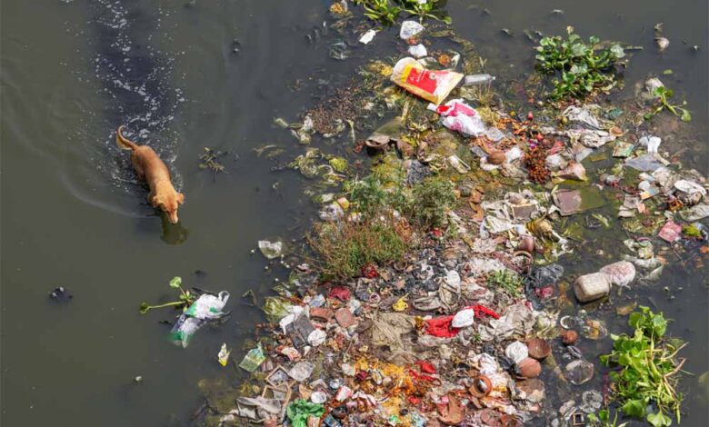 दिल्ली में यमुना नदी के किनारे पानी में तैरता कचरा