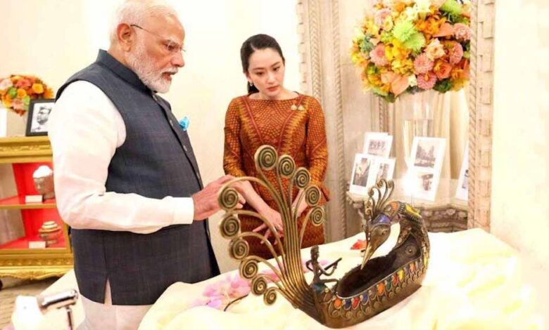 थाई प्रधानमंत्री शिनवात्रा को प्रधानमंत्री मोदी ने डोकरा पीतल की मोर नाव की भेंट