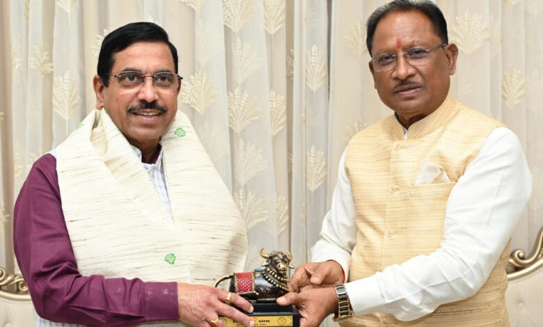 रायपुर : मुख्यमंत्री विष्णुदेव साय ने केंद्रीय मंत्री प्रहलाद जोशी का किया आत्मीय स्वागत