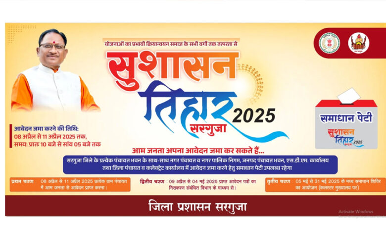 मुख्यमंत्री विष्णु देव साय के मार्गदर्शन में जनता-जनार्दन की समस्याओं के निदान और उनसे रूबरू मुलाकात के लिए सुशासन तिहार का प्रदेशव्यापी शुभारंभ आज 08 अप्रैल से हो गया है। तीन चरणों में आयोजित होने वाला यह सुशासन तिहार 31 मई तक चलेगा। प्रथम चरण में 8 अप्रैल से 11 अप्रैल तक आम जनता से ग्राम पंचायतों एवं नगरीय निकायों के कार्यालयों में सीधे आवेदन लिए जा रहे हैं। सुशासन तिहार को लेकर लोगों में जबरदस्त उत्साह देखने को मिल रहा है, और लोग अपनी समस्याओं से संबंधित आवेदन लेकर उसे ग्राम पंचायत और नगर पंचायत कार्यालयों में लगी समाधान पेटी में जमा कर रहे है।