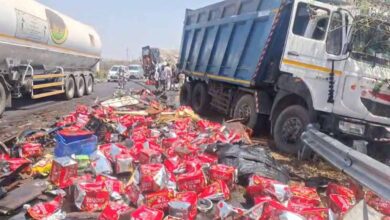 बिलखरिया में तेल से भरा ट्रक डंपर से टकराया, एक मौत, तेल के पीपे लूटने मची होड़