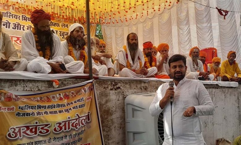 हाइवे को सिक्सलेन बनाने, गो अभ्यारण की मांग को लेकर शहर के खंडा रोड पर संतों का अखंड आंदोलन छठवें दिन भी जारी रहा। इस मांग को लेकर आठ संतों की भूख हड़ताल दूसरे दिन भी जारी रही। वहीं अन्न त्यागकर धरने पर बैठे संत प्रेमदास महाराज गोहद की अचानक से तबीयत बिगड़ गई। उन्हें उपचार के लिए जिला अस्पताल में भर्ती कराया गया। चिकित्सकों का कहना था कि संत का बीपी बढ़ा हुआ है। अखंड आंदोलन के छठवें दिन कांग्रेस के उपनेता प्रतिपक्ष एवं अटेर विधायक हेमंत कटारे मंगलवार को कांग्रेसी कार्यकर्ताओं के साथ आंदोलन स्थल पर पहुंचे। उन्होंने संतों के समक्ष हाथ जोड़कर प्रार्थना करते हुए भूख हड़ताल खत्म करने का आग्रह किया।