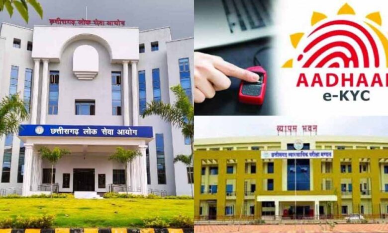 छत्तीसगढ़ लोक सेवा आयोग (सीजीपीएससी) और व्यावसायिक परीक्षा मंडल(व्यापमं) की तरफ से होने वाली भर्ती परीक्षाओं के लिए अब आधार कार्ड के जरिए ई-केवाईसी करवान अनिवार्य होगा। राज्य शासन की तरफ से इस संबंध में अधिसूचना जारी कर दी गई है।
