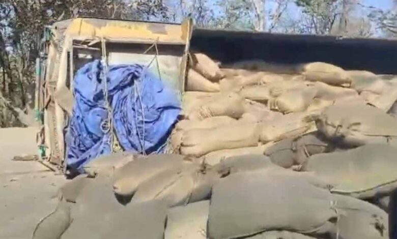 पेंड्रा बिलासपुर मुख्यमार्ग पर धान से लदा ट्रक पलटा