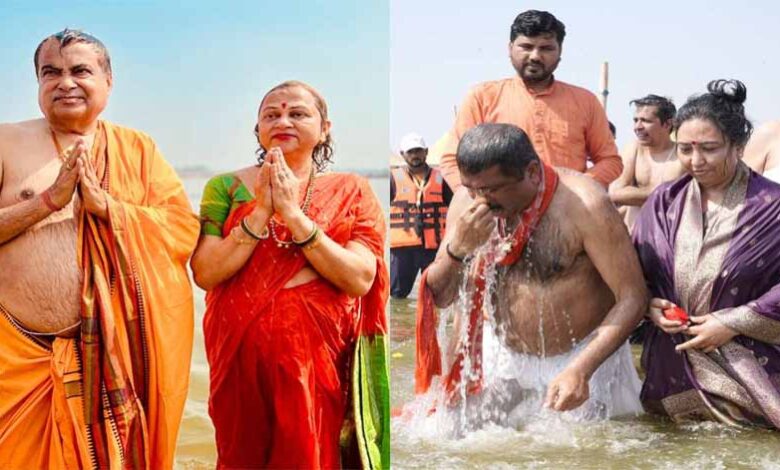 प्रयागराज पहुंचे केंद्रीय मंत्री नितिन गडकरी और धर्मेंद्र प्रधान, लगाई संगम में डुबकी