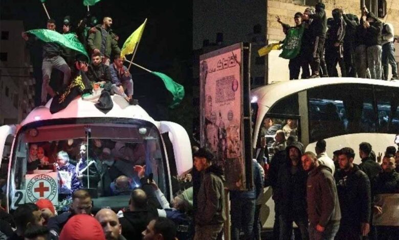 इजरायल की कैद से छूटे 90 फिलिस्तीनी बंधक जब गाजा पहुंचे तो वहां बड़ी संख्या में लोगों ने उनका स्वागत किया। सफेद वॉल्वो बसों में सवार इन कैदियों को इजरायल ने रेड क्रॉस को सौंपा था, जिसकी टीम इन्हें लेकर गाजा में दाखिल हुई तो जश्न मनने लगा। कुछ लोग तो बसों की छतों पर ही चढ़ गए और विक्ट्री साइन दिखाने लगे। इसके अलावा इन लोगों के हाथों में हमास और हिजबुल्ला के झंडे भी थे। इजरायल की कैद से छूटे 90 लोगों को लेकर बसें रामलल्हा से तीन किलोमीटर दूर स्थित बेतुनिया कस्बे में पहुंचीं तो जश्न मनने लगा। हजारों की संख्या में जुटे फिलिस्तीनियों ने बसों को घेर लिया और नारे लगाते दिखे। वहीं कुछ उत्साही लोग बसों पर ही झंडे लेकर चढ़ गए। हमास ने इजरायल के तीन बंधकों को छोड़ा था, जिसके बाद यहूदी देश ने भी बदले में 90 कैदियों को रिहा किया।